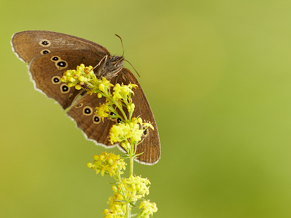 The Ringlet is a very common high summer butterflies which is resident throughout most (but not all) of Britain. In some areas it is very widespread, where it can easily be found in a variety of grassland habitats from flower meadows to roadside verges. It can also be found in urban gardens, it can be found nectaring on a wide variety of plants. It is a medium sized butterfly with a wingspan of about 47mm, the males emerge about a week before the females. Like many butterflies, it looks at it's best when freshly emerged when the rings are better coloured before they fade in the summer sun. These rings aid identification, later in the season the rings can fade and the overall colour can become become more of a golden brown in strong light and it takes on a similar appearance to other brown butterflies. |