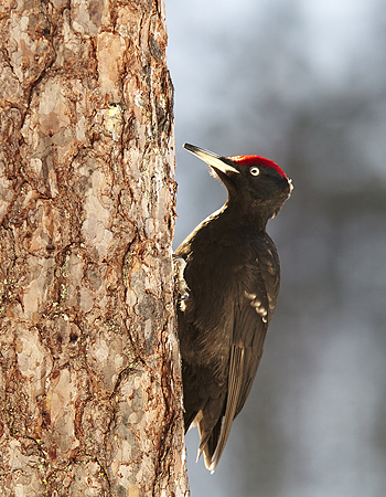 Identification of Black Woodpeckers from other European species is not hard due to their size and obvious black colour. Identifying males, females and juveniles can be a bit more tricky. All Black Woodpeckers have a red crown, this is much larger in males and extends as far as the beak. (the image above is of a male bird). With females the crown is duller in colour and is only on the rear of the crown, the top of the crown is black (the two images below is of female birds). Young and juvenile birds also have a red patch on the back of the neck, but this is duller in colour and often has black flecks. Adult birds have a dark tip to their bill and their eyes are white. Juveniles have dark eyes, their beaks are light in colour throughout and they have a pale grey throat. |